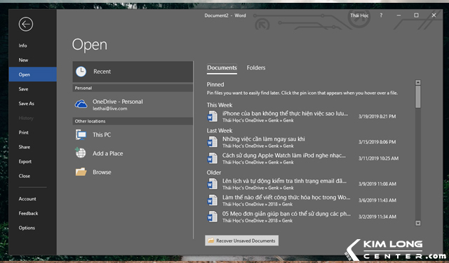 ứng dụng riêng lẻ như Word hay PowerPoint thông qua tùy chọn Recent của chúng.