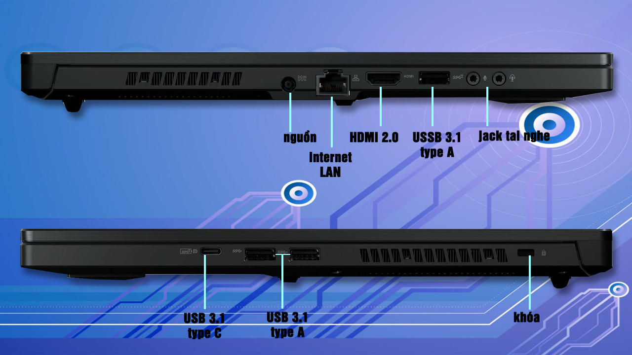 ASUS ROG Zephyrus M GU50 có đầy đủ các cổng kết nối dành cho việc giải trí và làm việc. Ở cạnh phải bảo gồm: 2 cổng USB 3.1 thế hệ 1 Type A, USB 3.1 thế hệ 2 Type C, một cổng khóa Kensington. Ở cạnh trái bao gồm: một cổng HDMI 2.0, một cổng USB 3.1 thế hệ 2 Type A, giắc cắm âm thanh và nguồn. Cho bạn một sự kết nối đa dạng với các thiết bị bên ngoài.