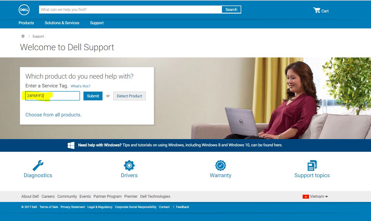 B1: truy cập vào trang chủ Dell Support , truyền vào số services tag của máy mình để tìm đúng driver với nó -> chọn submit