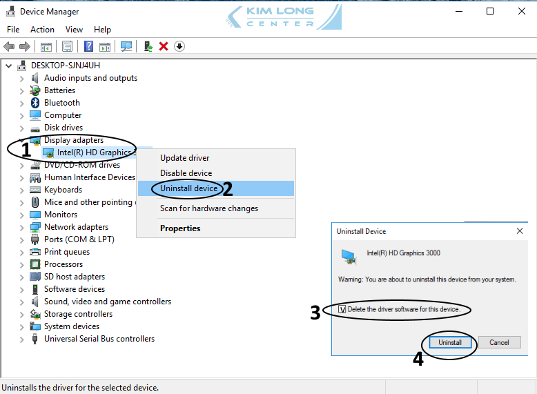 Để fix lỗi này, bước đầu tiên là bạn cần tháo driver VGA onboard ra trong phần Device Manager, bạn có thể search trong phần tìm kiếm mục Device Manager hoặc mở hộp thoại Window+R -> gõ lệnh “devmgmt.msc” . Tìm đến mục Display adapters -> Intel HD Graphics.. - > nhấp chuột phải vào chọn Uninstall device -> check vào Delete… -> rồi chọn Uninstall.
