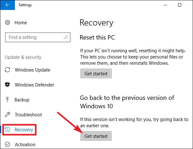 Tiếp theo chọn Recovery -> Ở mục Go back to previous version of windows 10 chọn Get started