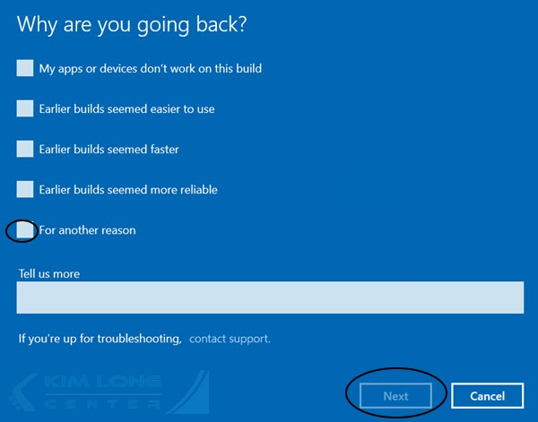 Hiển thị hộp thoại -> chọn for another resason - > Next