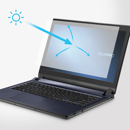 Để phù hợp với những người thường xuyên di chuyển và phải làm việc trong nhiều môi trường khác nhau, màn hình 14 inch HD của laptop ASUS PRO được trang bị lớp chống chói Anti Glare. Màn hình này giúp giảm thiểu các tia phản xạ không mong muốn và tăng cường chất lượng màu sắc, độ tương phản, giúp người dùng dễ dàng nhìn thấy màn hình trong mọi điều kiện ánh sáng khác nhau.