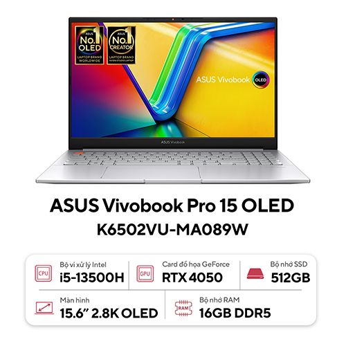 Asus Vivobook Pro 15 OLED K6502VU-MA089W : i5-13500H | 16GB RAM | 512GB SSD | RTX 4050 6GB | 15.6 inch 2.8K OLED + Finger Print | Windows 11 | Bạc