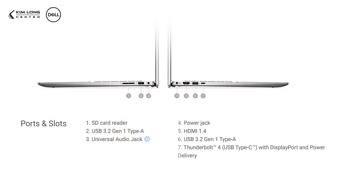 Dell Inspiron 14 5430 20DY3 cũng được trang bị các cổng kết nối đa dạng, bao gồm  HDMI 1.4, 2 cổng USB 3.2 Gen 1 Type-A và một cổng Universal Audio Jack. Nhờ vào những cổng này, bạn có thể kết nối dễ dàng với các thiết bị ngoại vi, màn hình và truyền dữ liệu một cách tiện lợi và linh hoạt.
