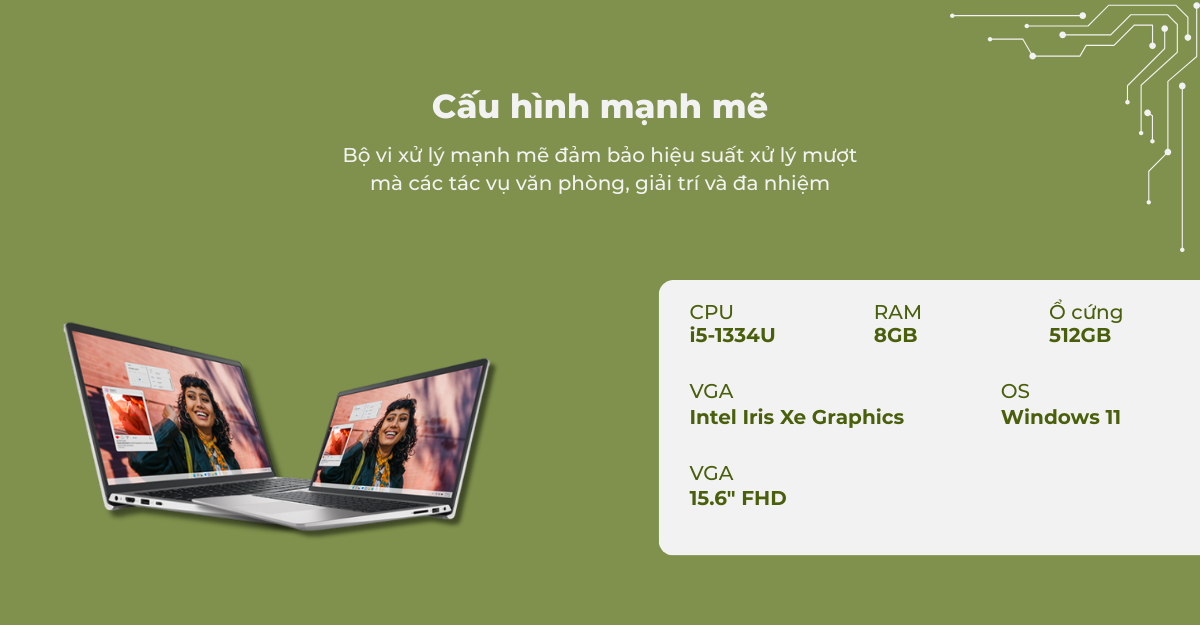 Dell Inspiron 15 3530 được trang bị bộ vi xử lý Intel Core i5-1334U mạnh mẽ với 10 nhân 12 luồng, tốc độ xung nhịp tối đa lên đến 4.6GHz, đảm bảo hiệu suất xử lý mượt mà các tác vụ văn phòng, giải trí và đa nhiệm. Dung lượng RAM 8GB và SSD 512GB giúp máy khởi động nhanh chóng, truy xuất dữ liệu linh hoạt, giảm thiểu độ trễ khi làm việc.