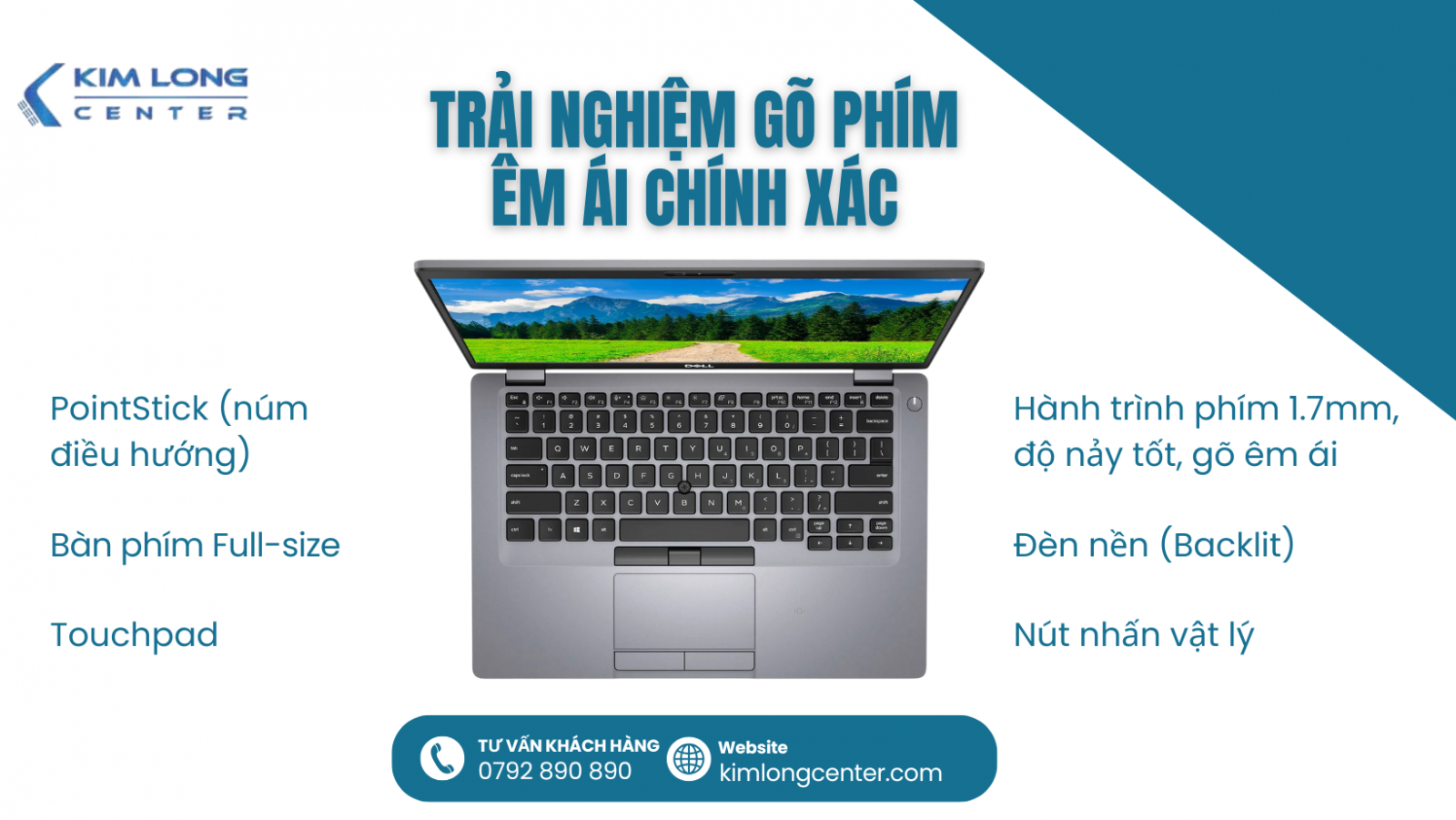 Bàn phím full-size với hành trình phím sâu (1.7mm), độ nảy tốt, mang lại trải nghiệm gõ phím êm ái, chính xác, giảm mỏi tay khi đánh máy liên tục. Phím Backlit hỗ trợ làm việc trong môi trường thiếu sáng. Touchpad rộng rãi, hỗ trợ đa điểm, tích hợp nút nhấn vật lý chắc chắn, cùng PointStick (núm điều hướng) giúp thao tác chính xác hơn khi làm việc với bảng tính hoặc thiết kế.