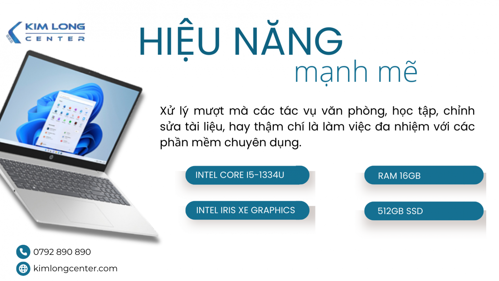 Dung lượng RAM 16GB DDR4 (2 x 8GB) cho phép mở đồng thời nhiều ứng dụng mà không bị chậm trễ hay giật lag. Ổ cứng 512GB PCIe NVMe M.2 SSD giúp khởi động hệ điều hành nhanh chóng, mở file và truy xuất dữ liệu với tốc độ vượt trội. Về đồ họa, máy được trang bị Intel Iris Xe Graphics, hỗ trợ xử lý các tác vụ thiết kế cơ bản, xem phim chất lượng cao hay chơi các tựa game nhẹ một cách mượt mà.