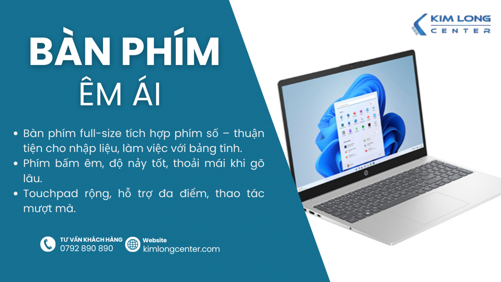 Laptop được trang bị bàn phím full-size tích hợp bàn phím số, hỗ trợ nhập liệu nhanh chóng và chính xác – rất tiện lợi cho những ai thường xuyên làm việc với bảng tính hoặc các tác vụ kế toán. Phím có độ nảy tốt, khoảng cách hợp lý tạo cảm giác thoải mái khi gõ lâu.