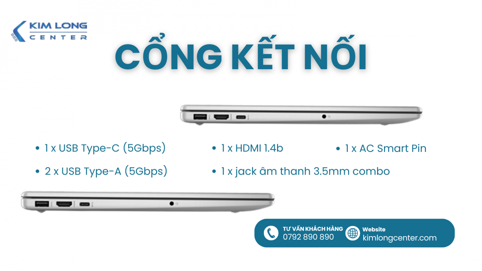 HP 15-fd0235TU được trang bị đầy đủ các cổng kết nối thiết yếu, giúp kết nối nhanh chóng với các thiết bị ngoại vi: