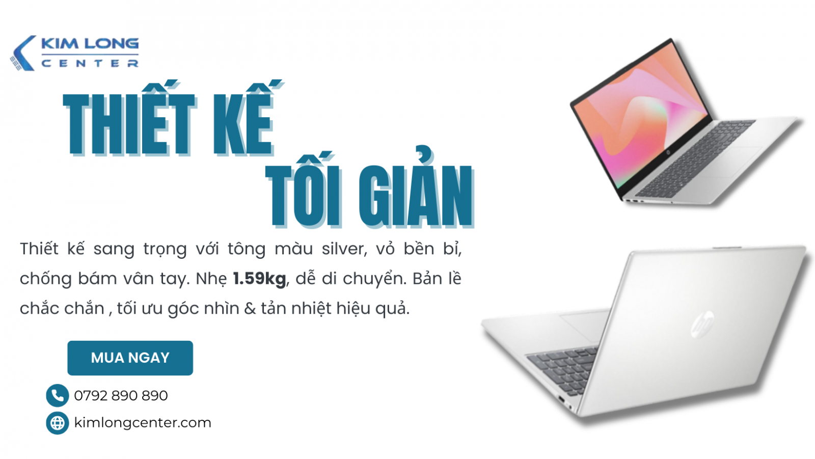 HP 15 gây ấn tượng bởi ngoại hình gọn gàng và tông màu bạc tinh tế, tạo cảm giác hiện đại và chuyên nghiệp. Các đường viền được bo nhẹ, mang đến vẻ ngoài mềm mại nhưng không kém phần chắc chắn. Với trọng lượng chỉ 1.59kg, bạn có thể dễ dàng mang máy theo đến bất cứ đâu – từ lớp học, quán cà phê đến văn phòng.