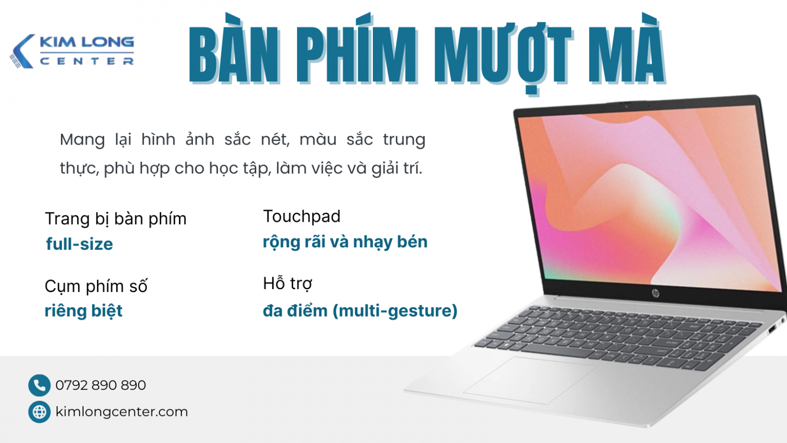 HP 15-fd0306TU được trang bị bàn phím full-size với bố cục khoa học và tích hợp cụm phím số riêng biệt, tối ưu cho công việc nhập liệu, tính toán và xử lý bảng biểu. Các phím có hành trình hợp lý, độ phản hồi tốt, mang lại trải nghiệm gõ êm ái và chính xác, kể cả khi làm việc trong thời gian dài.Touchpad được thiết kế rộng rãi và nhạy bén, hỗ trợ đa điểm (multi-gesture) cho các thao tác cuộn, thu phóng, chuyển đổi cửa sổ nhanh chóng, tăng hiệu quả sử dụng.