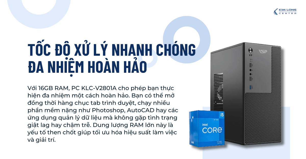 Với 16GB RAM, PC KLC-V2801A cho phép bạn thực hiện đa nhiệm một cách hoàn hảo. Bạn có thể mở đồng thời hàng chục tab trình duyệt, chạy nhiều phần mềm nặng như Photoshop, AutoCAD hay các ứng dụng quản lý dữ liệu mà không gặp tình trạng giật lag hay chậm trễ. Dung lượng RAM lớn này là yếu tố then chốt giúp tối ưu hóa hiệu suất làm việc và giải trí.