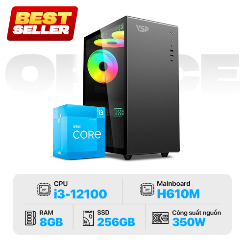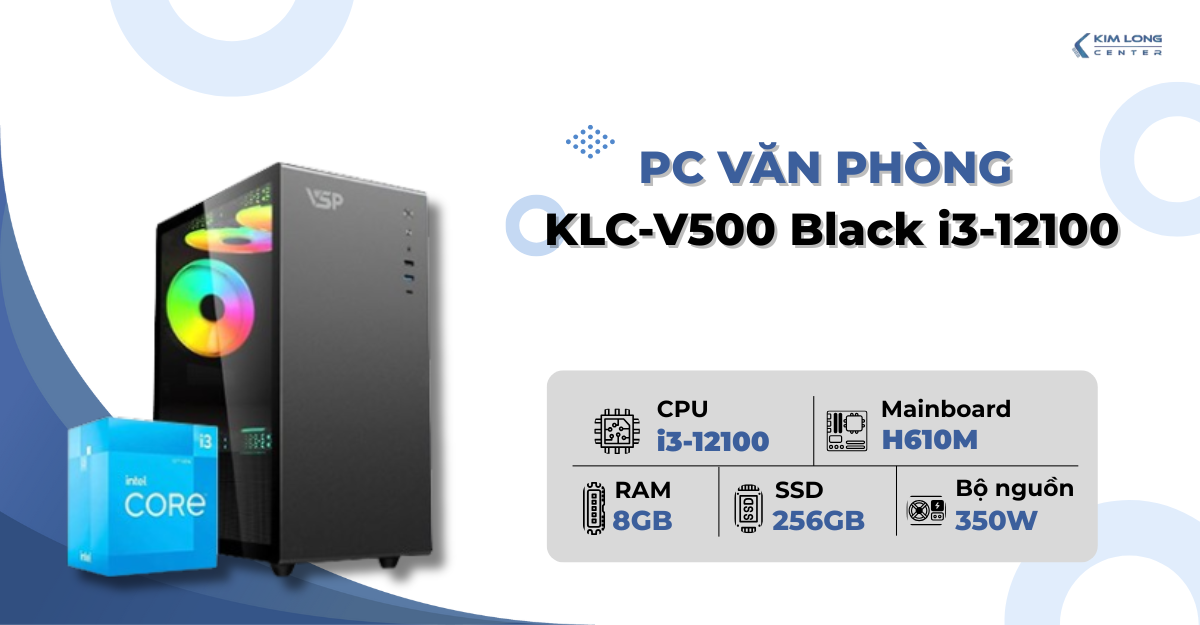 [New 100%] PC Văn phòng KLC-V500 Black i3-12100/ 8GB RAM/ 256GB SSD/ H610M/ P350W/ V500/ K&M K120