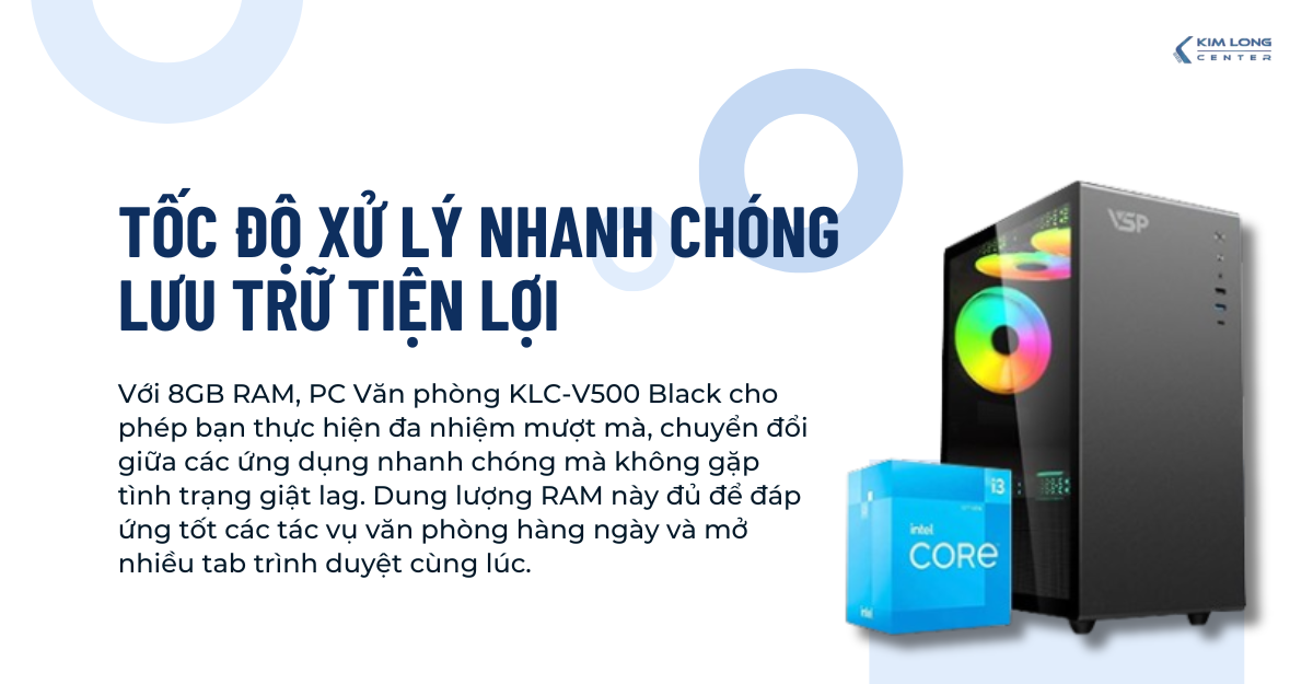 Với 8GB RAM, PC Văn phòng KLC-V500 Black cho phép bạn thực hiện đa nhiệm mượt mà, chuyển đổi giữa các ứng dụng nhanh chóng mà không gặp tình trạng giật lag. Dung lượng RAM này đủ để đáp ứng tốt các tác vụ văn phòng hàng ngày và mở nhiều tab trình duyệt cùng lúc.
