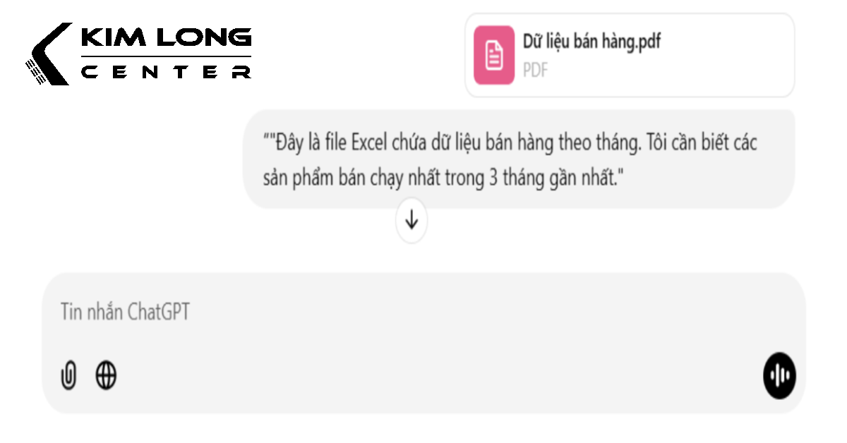 Ví dụ: bạn hãy đưa ra những yêu cầu dễ hiểu và cụ thể như “"Đây là file Excel chứa dữ liệu bán hàng theo tháng. Tôi cần biết các sản phẩm bán chạy nhất trong 3 tháng gần nhất." "Đây là file PDF báo cáo tài chính. Hãy tóm tắt các thông tin chính về doanh thu và chi phí."