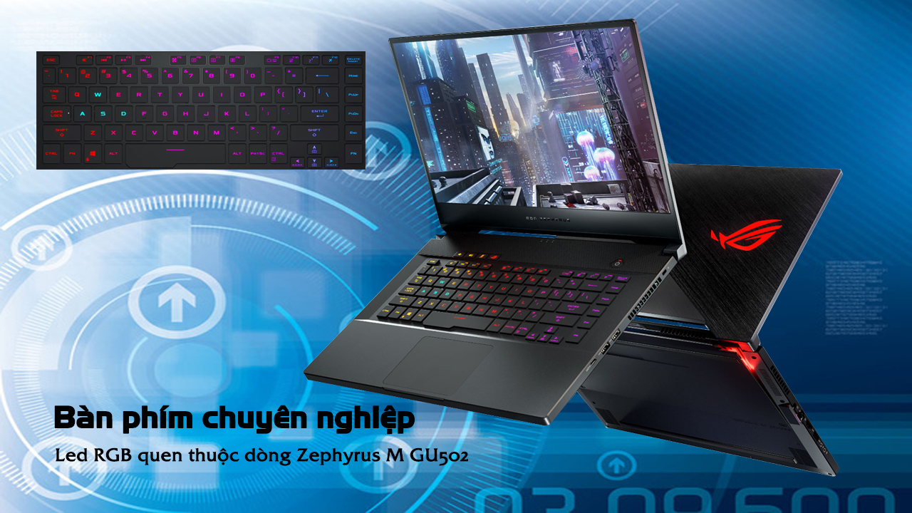 Bàn phím lấy cảm hứng từ thiết kế của chiếc máy tính để bàn được thiết kế cho việc trải nghiệm game. Vẫn được kế thừa bàn phím Led RGB quen thuộc trên dòng Zephyrus M GU502, độ sáng của bàn phím có thể được tùy chỉnh đảm bảo gia tăng hiệu suất chơi game và làm việc trên chiếc Laptop này. Công nghệ điều chỉnh này giúp bạn có thể tăng tốc độ chơi game cũng như làm việc, có thể đánh dấu những phím tắt mà bạn hay quên hoặc sử dụng để xác định các phím quan trọng khi bạn đang chơi bất kì một tựa game nào đó.