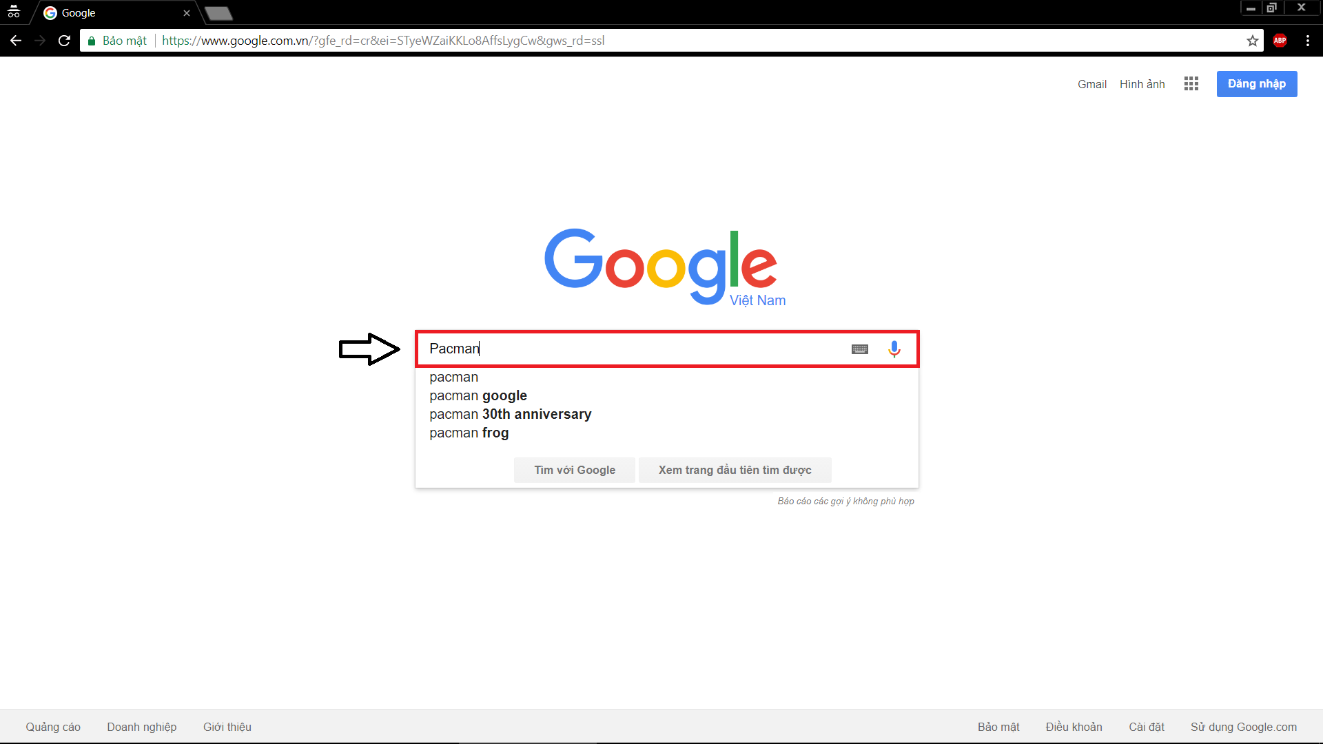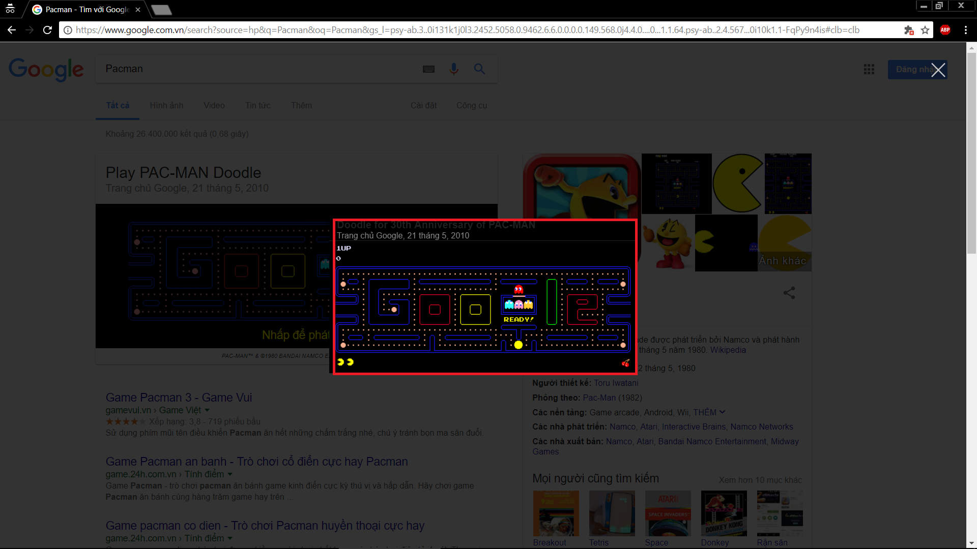 Pac-Man thì chắc là khá kinh điển rồi phải không? Trò chơi này được kích hoạt khá đơn giản, bạn chỉ việc nhập từ khóa "pacman" vào ô tìm kiếm, sau đó nhấn ENTER