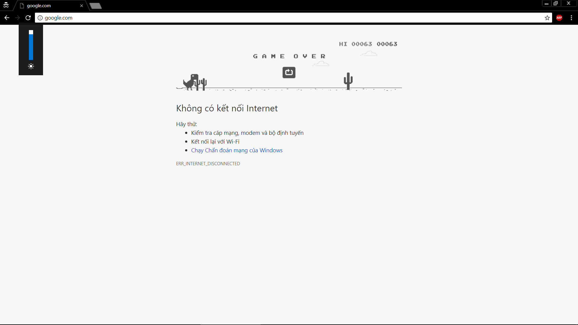 Chào các bạn trở lại với môi trường không mạng. Khi đó, màn hình Chrome sẽ hiện ra thông báo về việc máy tính không có kết nối mạng. Kèm theo là hình một chú khủng long T-Rex