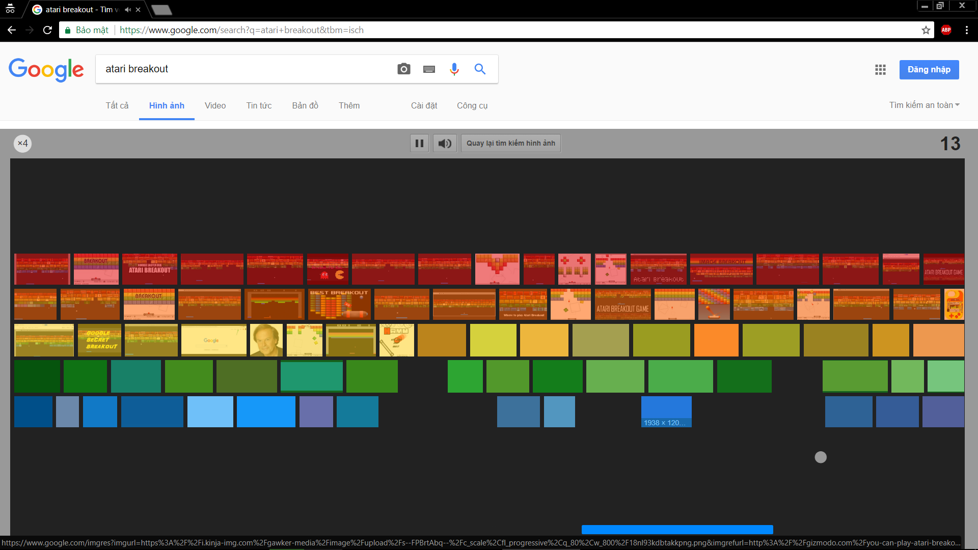 Trang tìm kiếm hình ảnh sẽ hiện ra, và ngay lập tức nó tự động chuyển qua giao diện trò chơi. Nhiệm vụ của bạn rất đơn giản là hứng những quả bóng rơi xuống và phản chúng lại theo đúng hướng để ăn các ô gạch phía trên